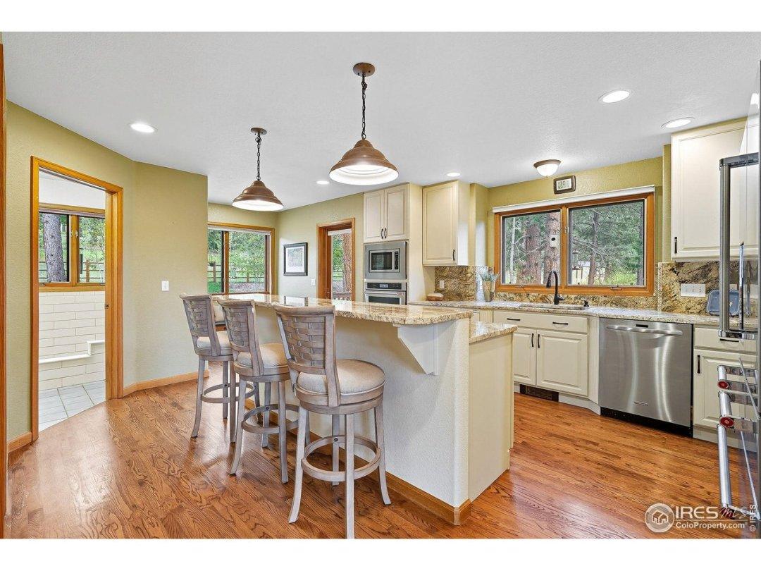 Retreat to the majestic mountains just outside Lyons, where this delightful home awaits with stunning vistas and visits from local wildlife, creating a pine-scented haven. With direct access to hiking and biking trails and Boulder nearby, adventures await right outside your door. The main level features an inviting great room adorned with a wall of windows that perfectly frames the serene pines, allowing natural light to illuminate the space. The updated kitchen shines with granite countertops, modern appliances, and generous room for entertaining family and friends. A cozy wood-burning fireplace serves as the heart of the home, providing warmth and charm during the chilly months. A bright office space offers an inspiring setting for remote work or creative pursuits. Step outside to the expansive 1,000+ sq ft wrap-around deck, perfect for outdoor gatherings, complete with hanging swings for ultimate relaxation. Upstairs, find three spacious bedrooms, including a primary suite with a laGeneral Features